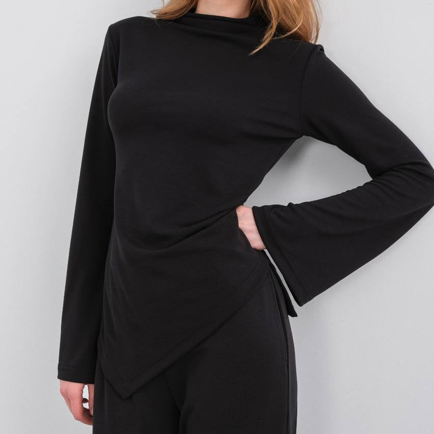 This two-piece set features a modern high-neck top with subtle asymmetric detailing and refined flared sleeves that add a sophisticated touch. The wide-leg pants offer a relaxed yet polished silhouette, flowing beautifully with every movement.